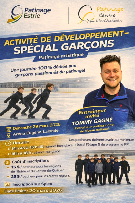 Patinage Estrie et Patinage Centre-du-Québec ont le plaisir d’organiser une activité de développement destinée spécifiquement aux garçons de vos clubs. Cette activité se tiendra le dimanche 29 mars 2026 à l’aréna Eugène-Lalonde. L’intervenant sur glace sera Tommy Gagné, entraîneur professionnel de niveau national. Les patineurs doivent avoir minimalement réussi l’étape 5 du programme Patinage Plus.